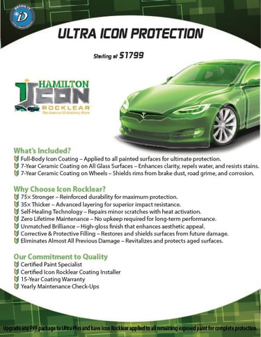Together, the Icon Rocklear Full Body Coating and 7-Year Ceramic Coating on Rims and Windows deliver comprehensive, all-around protection, keeping your vehicle looking sleek and maintaining its value while reducing the effort needed to keep it clean. This complete exterior package is perfect for those who want to preserve their vehicle’s appearance, prevent damage, and enjoy easy maintenance for years.